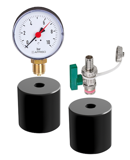 Druckprüfgarnitur-SET, bestehend aus einem PE-Übergang mit Füllanschluss und einem PE-Übergang mit Druckanzeige, zum Abdrücken bzw. zur Drucküberwachung von Solekreisläufen. Die PE-HD Übergänge besitzen ein 1/2" IG für die Montage des Füllanschlusses bzw. des Manometers. Die PE-Übergänge können mittels Muffe-Dorn Schweissung für 40 mm Rohre geschweisst werden und bei 50 mm Rohren kann die Schweissung mittels handelsüblicher Elektroschweissmuffe oder mittels Stumpfschweissung erfolgen.